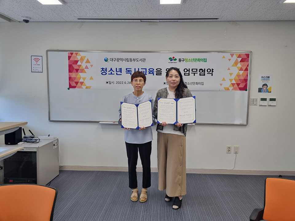 2022년 6월 28일(화요일), 대구광역시립동부도서관과 동구청소년문화의집이 청소년 독서교육을 위한 업무협약을 체결하였다. 협약식에는 대구광역시립동부도서관 관장 김화숙, 독서문화과장 이재숙, 독서문화과 주무관 신수경, 동구청소년문화의집 관장 도현지, 청소년방과후아카데미 팀장…